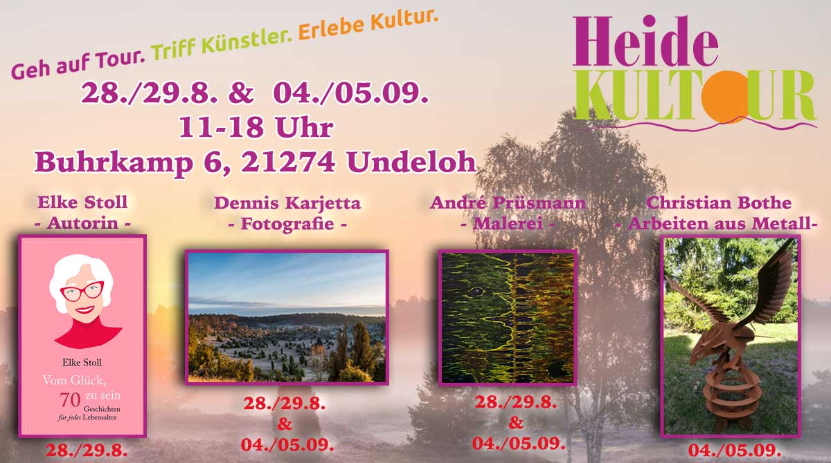 In diesem Jahr veranstalte ich eine Ausstellung im Rahmen der Heidekultour 2021. Am 28.+29. August 2021 sowie am 04.+05. September 2021 stelle ich in Undeloh aus.